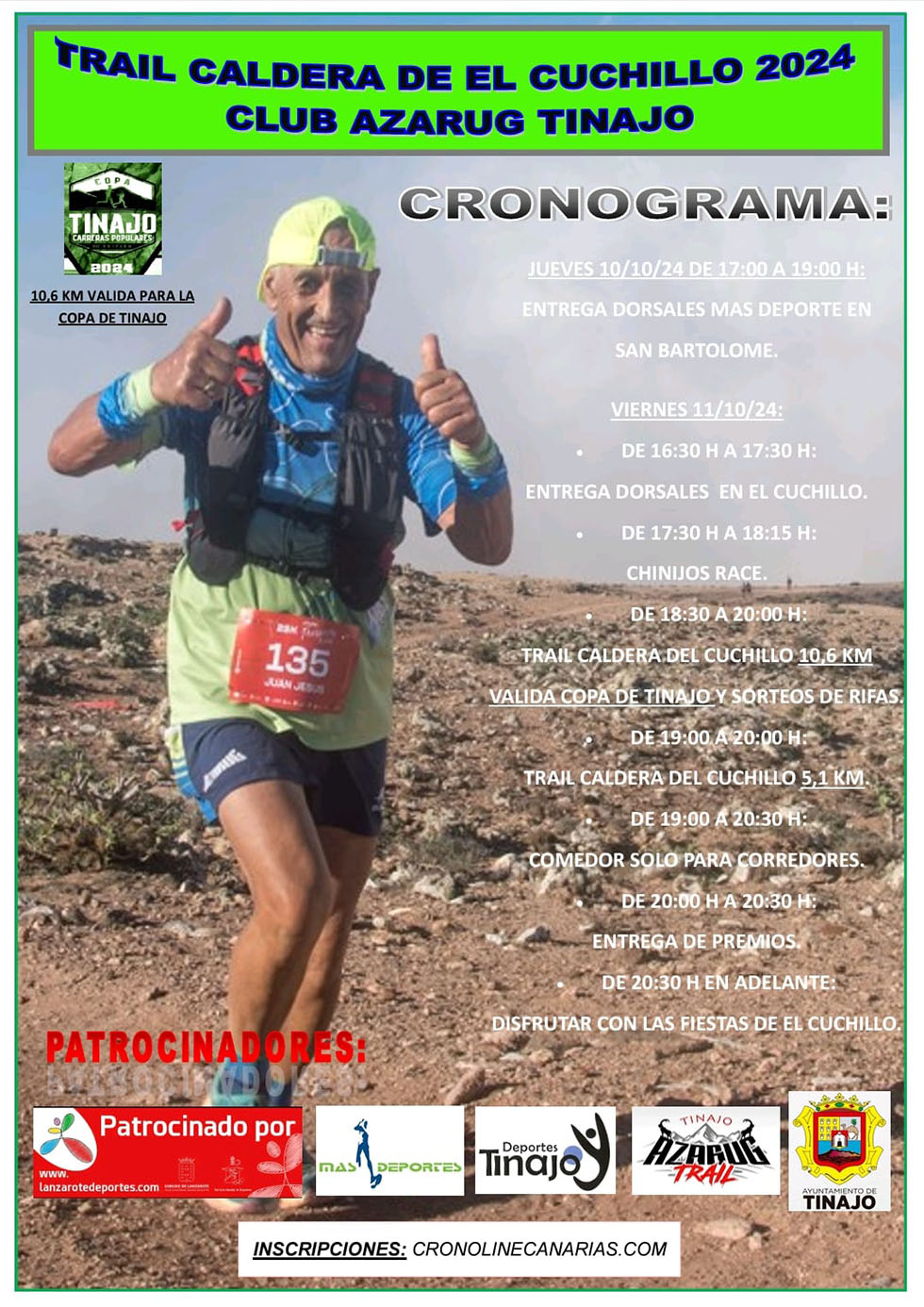 La prueba deportiva de El Cuchillo, organizada por el Club Azarug Tinajo, cuenta con la colaboración del consistorio tinajero, de Deportes Tinajo, de Lanzarote Deportes y Más Deportes y consistirá en las habituales pruebas, arrancando con la carrera para los más pequeños, la Chinijos Race, la prueba de 5.1 kilómetros y la prueba grande de 10.6 kilómetros, valedera para la Copa de Carreras Populares de Tinajo. Inscripciones para las distintas pruebas en la página web cronolinecanarias.com