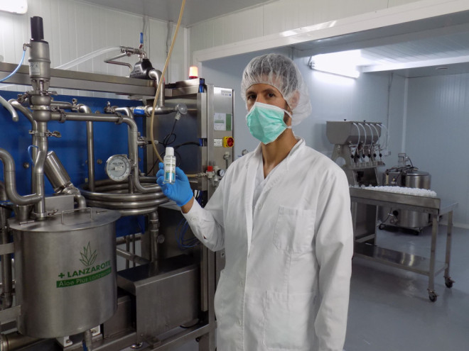Interior de la fábrica de Aloe Plus Lanzarote. Un operario muestra el producto final.