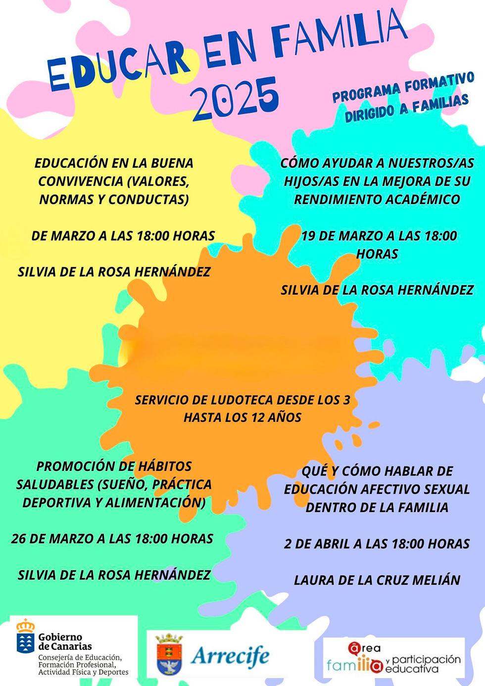 La de este miércoles lleva por título 'Educación en la buena convivencia (valores, normas y conductas)'. La segunda jornada será el 19 de marzo bajo el epígrafe 'Cómo ayudar a nuestros hijos/as en la mejora de su rendimiento escolar'. La tercera, el 26 de marzo titulada 'Promoción de hábitos saludables (sueño, práctica deportiva y alimentación)'. La cuarta y última jornada, el 2 de abril, será impartida por la psicóloga Laura de la Cruz Melián bajo el título 'Qué y cómo hablar de educación afectivo sexual dentro de la familia'.