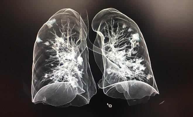 En la imagen de abajo, la parte superior de los pulmones es casi normal, y en la parte inferior (que corresponde a la espalda del paciente), todo la que aparece como blanco es patológico.