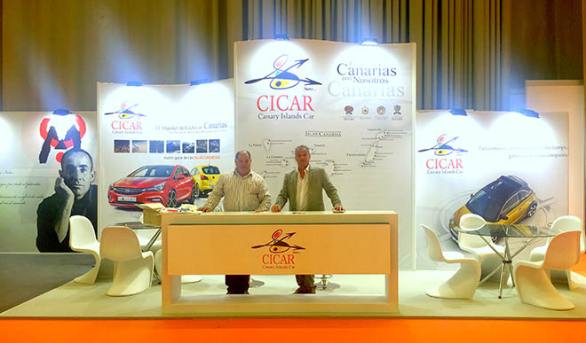 El stand de CICAR informa sobre la réplica del modelo del Seat Ibiza pintado por César Manrique en 1987. La empresa lanzaroteña realizó casi un centenar de réplicas del vehículo, que han sido incorporadas a su flota de coches de alquiler en las siete islas de Canarias. Esta iniciativa ocupa una de las alas del stand CICAR/Grupo Cabrera Medina, presidido por una fotografía a gran escala de Manrique.