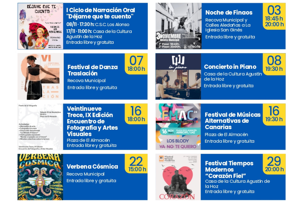 El cartel diseñado por Cultura Arrecife incluye también cuatro presentaciones literarias en la Casa de la Cultura Agustín de la Hoz. Las tres primeras, los días 14, 15 y 19 de noviembre a partir de las 19 horas y en las que se darán a conocer, respectivamente, las obras 'Calima' de Lola Suárez y Víctor Jaubert, 'La cultura del volcán. Cómo Timanfaya cambió la historia de Lanzarote' (José De León Hernández) y 'El Justicia del Llano' (Ángel Guerra). La cuarta, a las 19.30 horas del día 26, a cargo de la periodista y escritora Myriam Ybot, que presentará 'Pasos de Jable y Volcán'.