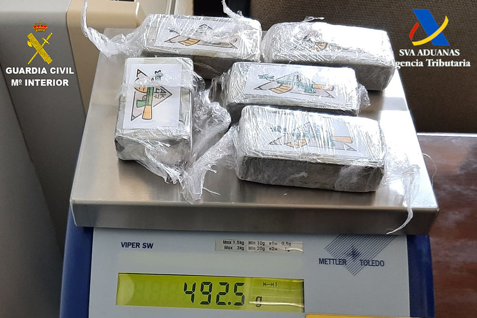 El pasajero que inicialmente negaba llevar nada extraño en el interior de su equipaje, tras la exploración del mismo y en un bolsillo cerrado con cremallera se le interceptaron cinco tabletas de una sustancia resinosa color marrón, aparentemente hachís, motivo por el que se le realizaron los test correspondientes dando positivo a esta sustancia que arrojaba un peso total de 492 gramos.