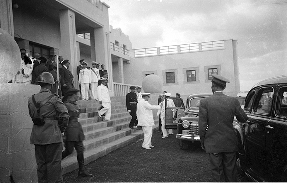 Francisco Franco a su llegada a Arrecife el 28 de octubre de 1950, acompañado por el alcalde, Domingo González Robayna. Foto realizada y cedida por Eduardo Martín.