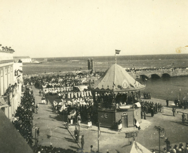 Aspecto multitudinario que ofrecía la Avenida “Generalísimo Franco” (hoy “La Marina”) durante la visita de Francisco Franco el 28 de octubre de 1950. Presidiendo la imagen encontramos el Kiosco de la música, ubicado en el conocido como “Muelle de las Cebollas”, y tras él el Puente de las Bolas. Imagen cedida por José Manuel Rodríguez Pérez.