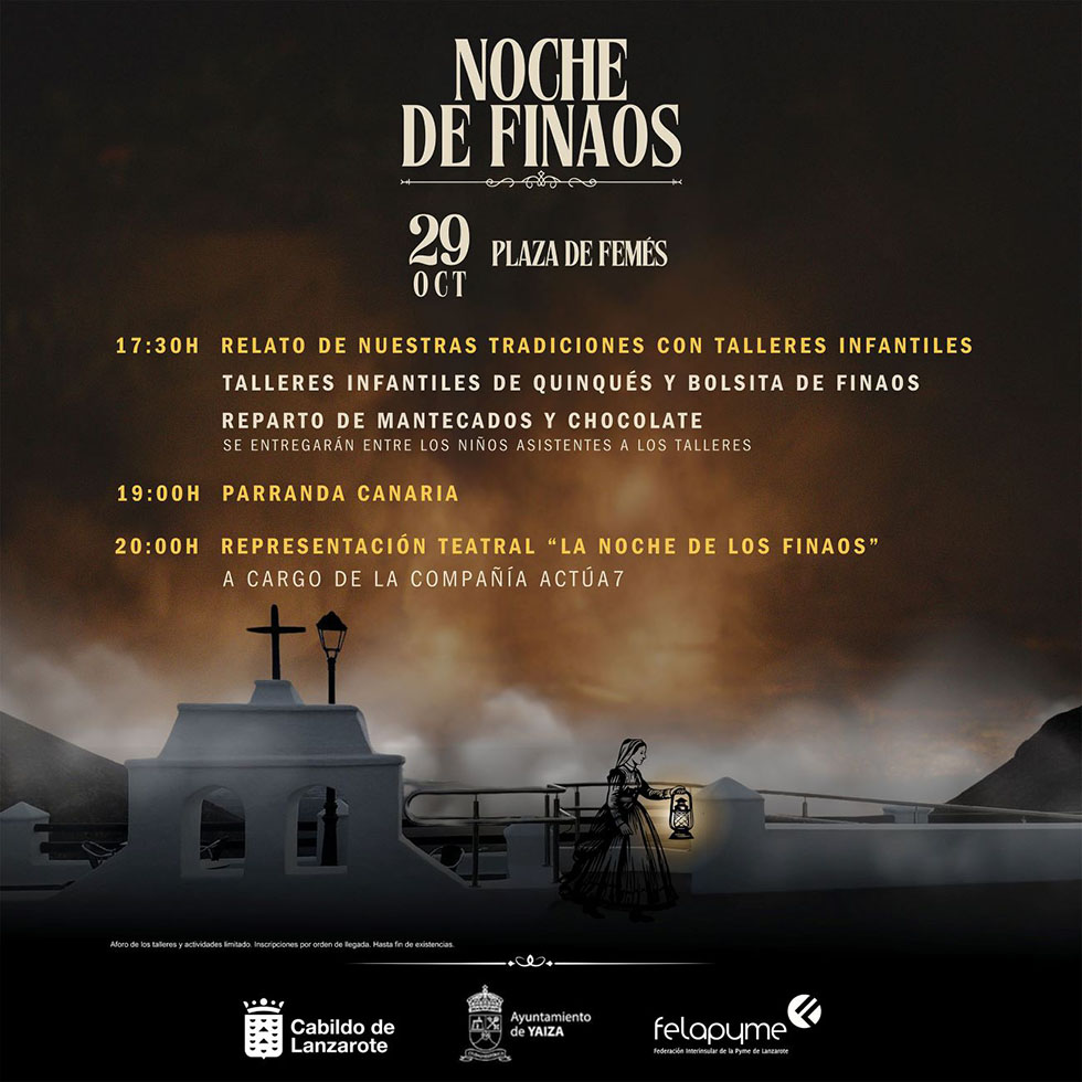 El Ayuntamiento de Yaiza invita a vecinos y vecinas del municipio a la celebración de la Noche de Finaos prevista en la plaza del pueblo de Femés este martes 29 de octubre animada por un amplio programa de actividades a partir de las 17.30 horas, jornada lúdica y artística para recordar tradiciones canarias.
