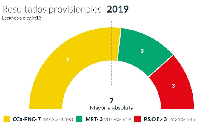 Con el cien por cien escrutado, CC obtiene más del 49 por ciento de los votos (1.493 en total) aunque pierde un concejal respecto a 2015.