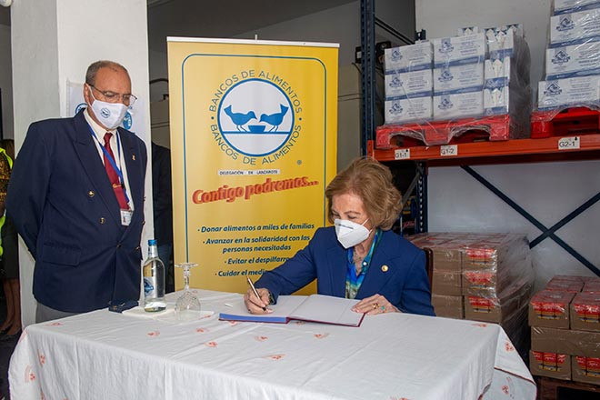 Doña Sofía se ha desplazado esta semana a Canarias para conocer el problema de primera mano y ha acudido a Lanzarote tras haber visitado este jueves el Banco de Alimentos de Gran Canaria.