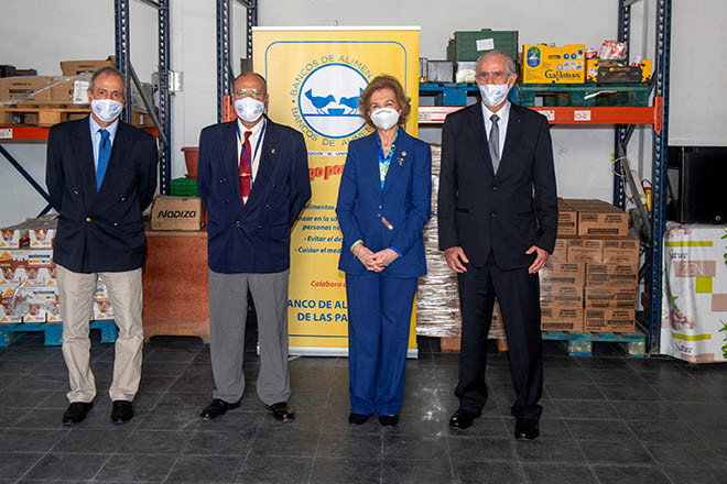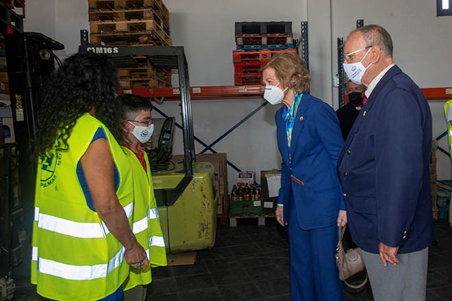 La reina Sofía se ha interesado este viernes por la labor que desarrolla el Banco de Alimentos en Lanzarote, y se ha reunido con los voluntarios que trabajan en la entidad para intentar paliar las necesidades de las personas más desfavorecidas, acrecentadas por la crisis derivada de la covid-19.