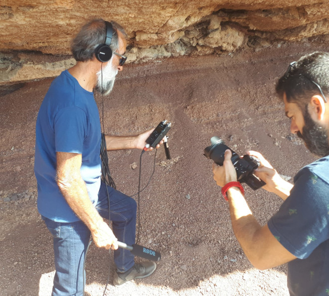 Aguilar comienza su propia búsqueda del sonido y su fusión con la imagen porque considera que su música es para ser oída y para ser vista. Dice en el documental que le fascina “descubrir nuevos sonidos” y comienza a registrar esos sonidos de la naturaleza: el viento, probablemente el sonido más característico de la Isla, “lo que define de manera más rotunda el sonido de Lanzarote”, pero también el mar, de donde nacen sus primeras grabaciones. Igualmente, a finales de los años sesenta, comienza a realizar sus primeros audiovisuales, con Lanzarote como protagonista.