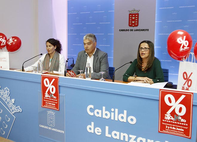 El presidente accidental del Cabildo de Lanzarote, José Juan Cruz, acompañado por la consejera de Industria y Comercio de la primera Corporación, Ariagona González, y la concejal de Comercio y Consumo del Ayuntamiento de Arrecife, Isabel Mesa, ha presentado ante los medios de comunicación la quinta muestra de oportunidades "Stockazo".