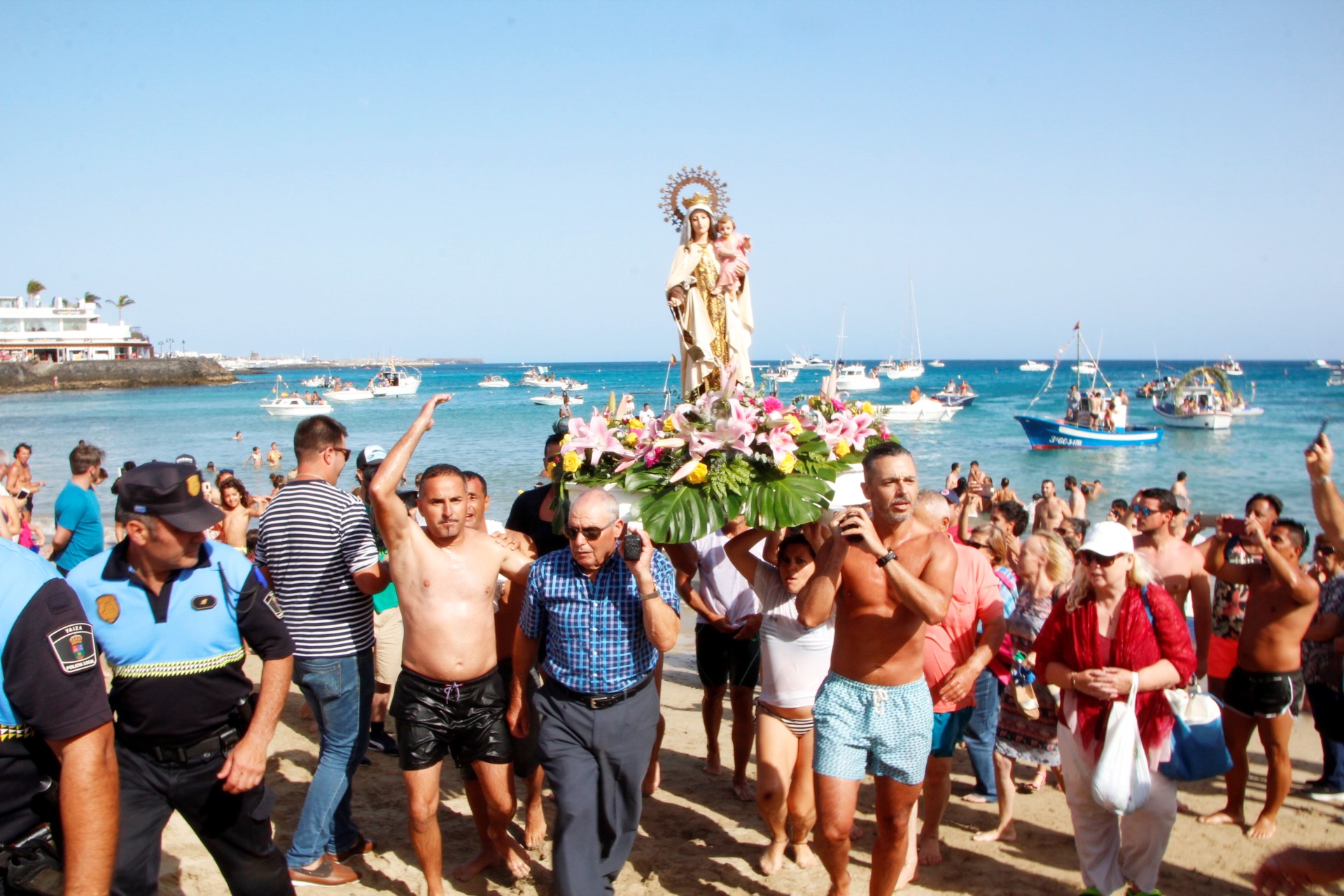 Una misa de corta duración presidida por el cura de Yaiza, Sixto Álvarez, precedió la bajada de la patrona de la iglesia a la playa mientras cantaba y tocaba la parranda Pal' Porrón. Tras 14 años de servicio a la comunidad cristiana sureña, Álvarez deja la parroquia de Yaiza para continuar su misión en otro destino, así, la de 2018 fue su última procesión marítima como párroco en este periodo de trabajo en Yaiza.