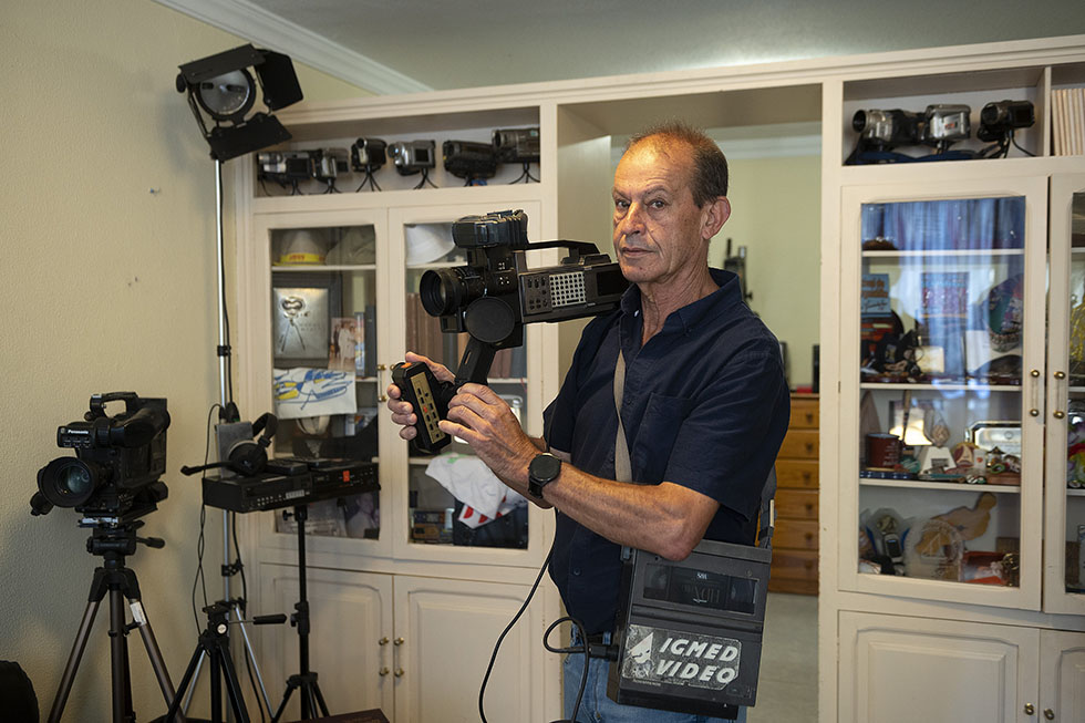 Rafael cuenta con alrededor de medio centenar de cámaras de vídeo en su colección. “Aquí”, dice en su estudio, “tengo de las pequeñas, de 8 milímetros, high 8 y digital 8… el tipo de cinta es la misma, pero el formato es diferente. Los DV, otro formato, y luego los VHS”, explica con emoción. Sin embargo, su labor tras la cámara se acabó hace algún tiempo y ahora aprovecha la jubilación para visionar y digitalizar todos sus archivos VHS, en una ardua tarea, desde que empezó hasta la actualidad. Buena parte de sus grabaciones se encuentran en ese formato y “hay que digitalizarlas antes de que las cintas se vayan estropeando o se pierdan”.