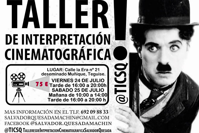 El actor Salvador Quesada impartirá los próximos días 24 y 25 de julio un taller de interpretación cinematográfica, que “ya ha sido desarrollado, desde hace diez años, en diversos lugares de España, con éxito y aceptación por parte de los asistentes”, según señala el también profesor de interpretación.