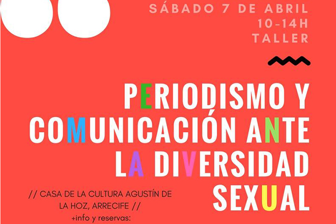 La Unión de Profesionales de la Comunicación de Canarias (UPCC) y el colectivo de Lesbianas, Gays, Transexuales y Bisexuales (LGTB) de Canarias Gamá imparten este sábado 7 de abril en la Casa de la Cultura Agustín de la Hoz (Arrecife, Lanzarote) el taller gratuito "Periodismo y Comunicación ante la Diversidad Sexual". Este nuevo curso que forma parte de la agenda de formación del sindicato de periodistas canarios está abierto a todas las personas interesadas, con plazas limitadas hasta llenar el aforo, y tendrá 4 horas de duración, de diez de la mañana, a dos de la tarde.