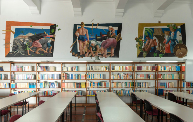 A pocos metros se pueden observar otros más amplios y desarrollados en la antigua sede del Parador Nacional de Turismo de Arrecife, que hoy alberga la UNED (Universidad Nacional de Educación a Distancia). Con los títulos de Alegoría de la isla, El viento, La pesca y La vendimia, estas pinturas retratan la vida del campesino y el marinero lanzaroteño. Los frescos son de 1950 y recogen figuras, paisajes y utensilios de la vida cotidiana lleno de colorido y vitalidad.