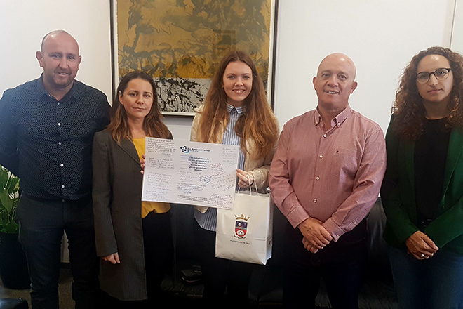 El alcalde de Tías, José Francisco Hernández, acompañado por el teniente de alcalde, Amado Jesús Vizcaíno, y la concejal de Educación, Aroa Pérez, han ofrecido una recepción oficial a Cristina Ioana Dudut en la sede de la Alcaldía, en el edificio central del Ayuntamiento de Tías, con la presencia de la directora del Instituto de Puerto del Carmen, Luz Baena.