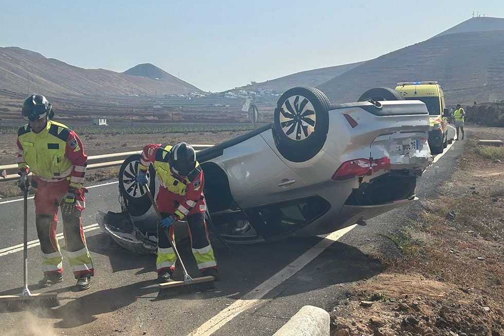 El suceso ha tenido lugar en la carretera general de Femés a Las Casitas, en el municipio de Yaiza, hacia las 16.45 horas, y tras el choque, el turismo ha volcado.