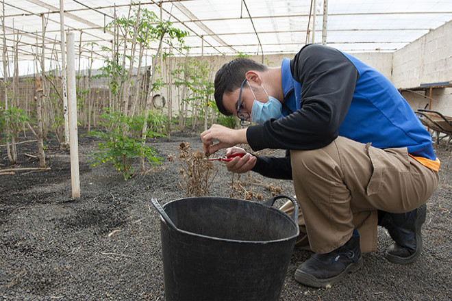 Teno Osorio, jefe del departamento de Ciencias Agrarias del IES Teguise, no puede ocultar su pasión por la docencia. Este curso imparte el módulo de FPB (formación profesional básica) de agrojardinería, “dirigido a alumnos y alumnas repetidores de ESO, que encuentran en esta formación una segunda oportunidad de acceder a un certificado de nivel 1, además del título de la ESO enfocado a la agricultura y jardinería”, y un ciclo FPBA (FP adaptada), que forma a auxiliares en viveros, “para chicos y chicas con alguna diversidad funcional de al menos un 33 por ciento”, explica.
