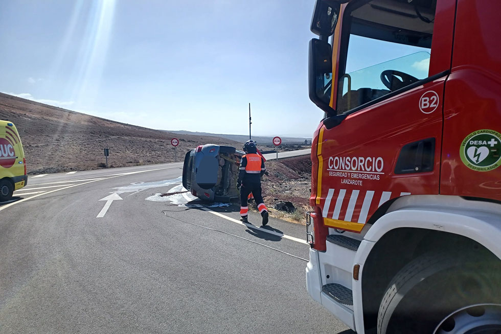Un vehículo volcó en la tarde de este domingo en una rotonda a la salida de Yaiza, según informó el Consorcio de Seguridad y Emergencias de Lanzarote.