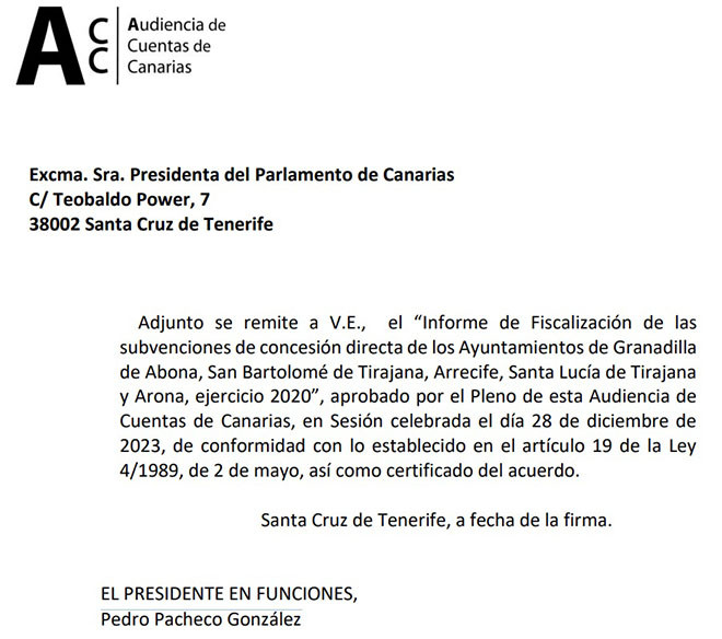 La Audiencia de Cuentas destacaba desde el inicio del informe de fiscalización que el estudio se enviaría  a los ayuntamientos, al Parlamento de Canarias que presidía Ástrid Pérez desde junio de 2023, después de dimitir como alcaldesa de Arrecife, y al Tribunal de Cuentas, que fue el que intervino a la vista del contenido del análisis realizado sobre las ayudas.