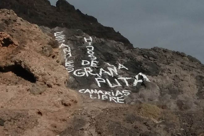 La asociación llama la atención de las frases escritas y de su sentido, porque rotular que “Los españoles son hijos de la gran puta. Canarias Libre”, por ejemplo, como dice una de ellas, “permite mucho margen para calificar la autoría de las pintadas”.