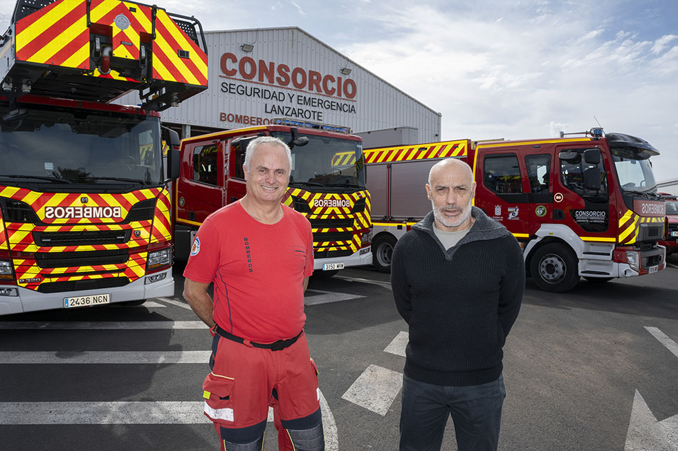 Los cabos Andrés Pérez y Luis Perdomo acaban de conmemorar los 35 años de servicio. Son los dos bomberos más veteranos del Consorcio de Seguridad y Emergencias de Lanzarote. Comenzaron su carrera incluso antes de que esta entidad existiera. Fue en 2008 cuando Gobierno de Canarias, Cabildo de Lanzarote y ayuntamientos acordaron su puesta en marcha. Tuvieron el privilegio de estrenar el primer Parque de Bomberos de la Isla, que precisamente conmemora este año sus 35 años de historia.