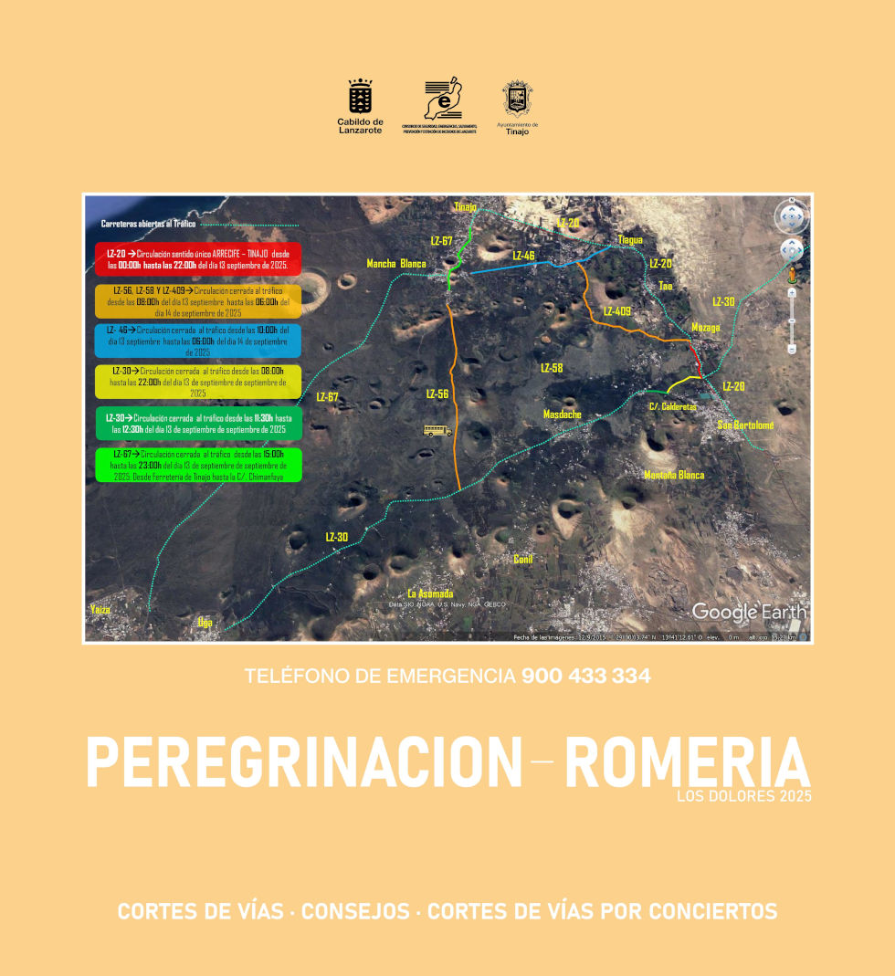 Asimismo, la LZ-67 (La Santa-Yaiza), se cortará en ambos sentidos desde la ferretería de Tinajo hasta la calle Chimanfaya, desde las 15.00 del sábado hasta la finalización de la romería.