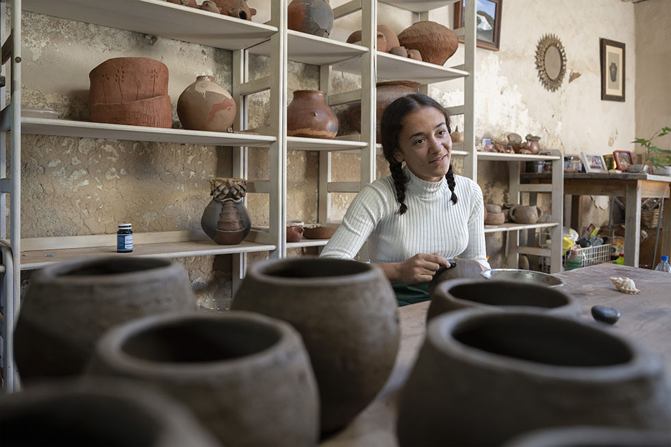 La primera pieza tenía dos asas y unas líneas en rojo y negro. “Tuve que bruñirla, porque hay que sacarle brillo, se me rompió una de las asas y lo que hice fue pegarla con pegamento y luego ponerle una especie de polvo de oro y repararla”. Lo cuenta Hirahi Rodríguez (Punta Mujeres, 2005), que mientras habla está puliendo una pieza con un callao.