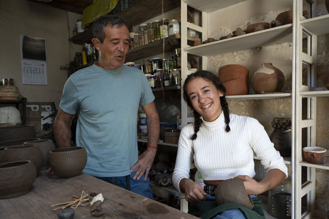 Hirahi es la alfarera más joven de la Isla y probablemente también de más allá. Solo tiene 19 años y con 17 ya solicitó que la examinaran para conseguir el carnet de alfarería tradicional. Le viene de familia, porque es hija de Aquilino Rodríguez, maestro alfarero, pero ella, por una parte, mantiene lo que le ha enseñado su padre y por otra, va incorporando su propia visión. Por ejemplo, a algunas piezas les incorpora unos mandalas, que empezó dibujándose en la mano en el colegio y ha acabado trasladando a la cerámica: “Es una forma de atraer al ojo”.