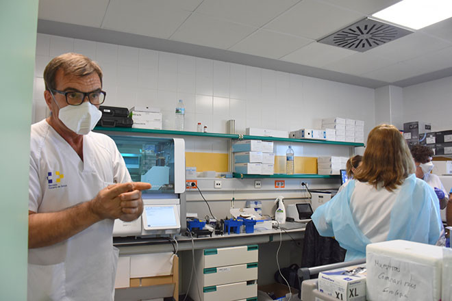 En el laboratorio, Miguel Ángel López, jefe del laboratorio, muestra las dos máquinas que hacen los test, en un espacio muy reducido de unos ocho metros cuadrados. Explica que se analizan tres fragmentos de la secuencia del ácido nucleico y si los tres son positivos, el test es positivo.