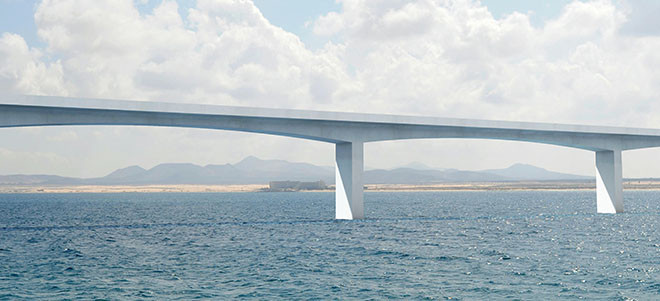 Fuerteventura y Lanzarote están separadas por una lengua de mar de poco más de 13 kilómetros. Por el estrecho de la Bocaina ya navegan más de un millón de pasajeros al cabo del año a bordo de las tres líneas regulares que hay en la actualidad. En el Cabildo de Fuerteventura han puesto sobre la mesa ir más allá y han incorporado al Plan Insular de Ordenación (PIOF) un estudio sobre la posibilidad de construir un puente que conecte las dos Islas orientales.