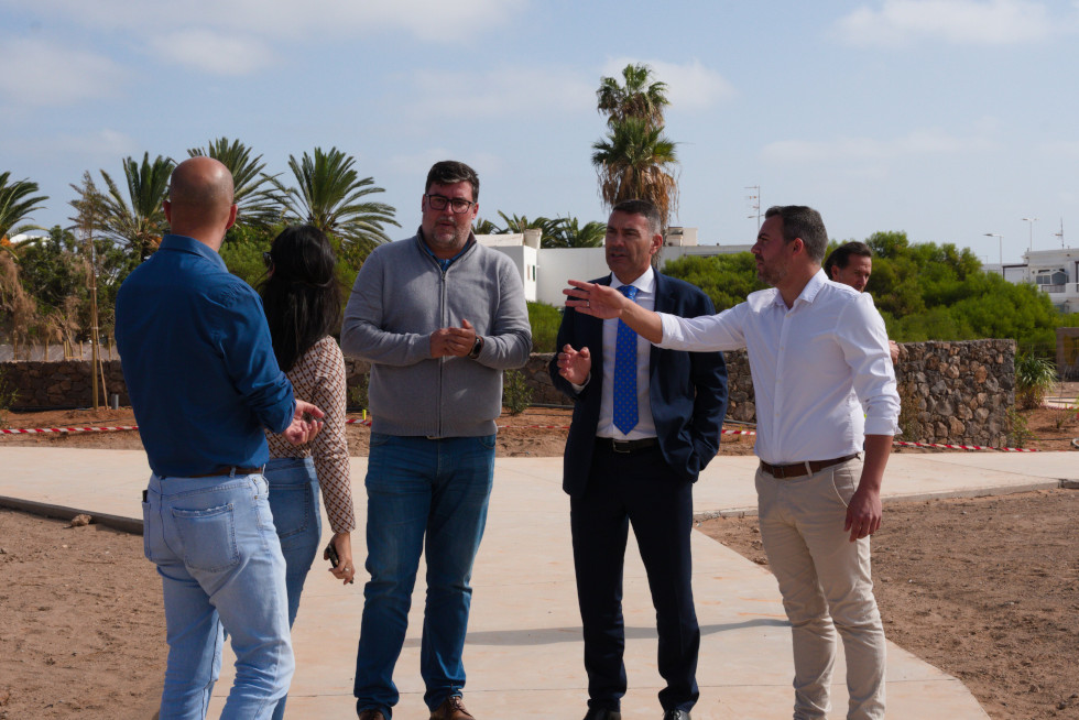 Oswaldo Betancort y Jacobo Medina pusieron especial interés en esta visita a la localidad en conocer el estado de ejecución del futuro Parque Urbano de Playa Honda, un pulmón verde para el que se han invertido alrededor de tres millones de euros provenientes del Fondo Europeo de Desarrollo Regional (FEDER).