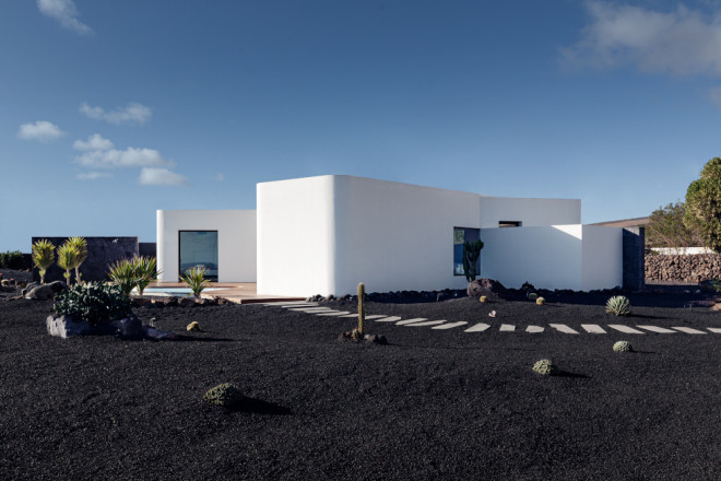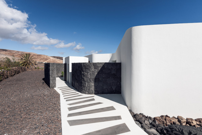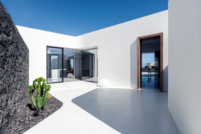 Se entra por un camino blanco, que es un camino rústico. “Un muro de piedra volcánica te conduce hacia el interior de los patios, creando una sensación de sorpresa al llegar a ellos”, señala Zorrilla. La casa tiene dos entradas separadas y pueden coincidir, sin convivir, dos familias. Tiene tres habitaciones y dos salones cocina. Cuenta con piscina y con jacuzzi y hay una continuidad entre el interior y el exterior, tanto por las cristaleras como por el jardín.