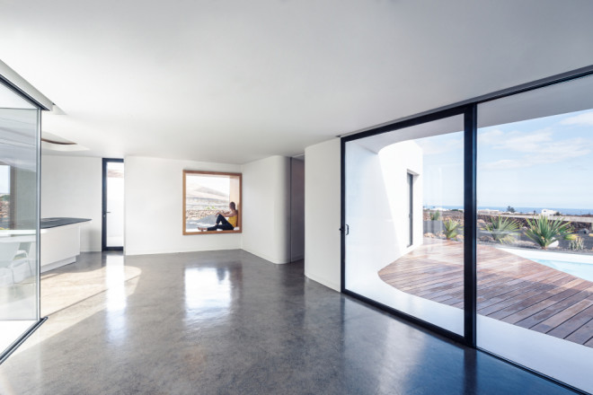 Los promotores han plantado un jardín de cactus en el exterior, que le aporta también esa sensación de continuidad. Dice el arquitecto que los propietarios dejaron hacer y tienen buen gusto y que en el proyecto se tuvo en cuenta el viento, la búsqueda de rincones asocados, aunque se dio prioridad a las vistas. “Hay que convivir con el viento, se intenta evitar, pero lo principal eran las vistas porque es una casa vacacional”, señala.
