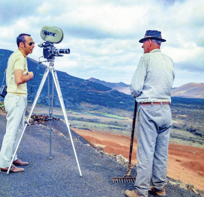 El cineasta ‘amateur’ Pedro Siemens charla con un campesino en la zona de La Geria durante el rodaje del documental ‘Lanzarote 69’, que este autor rodó en la Isla en el año 1969. Fotografía cedida por Siemens a Memoria de Lanzarote.