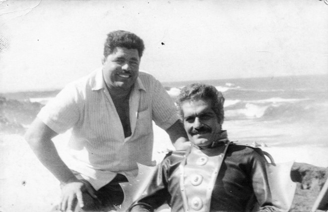 Fotografía realizada a Omar Sharif y a Heraclio Niz Mesa, el ‘Pollo de Arrecife’, en la playa de Las Malvas durante el rodaje de ‘La isla misteriosa’ en 1972. Imagen cedida por la familia de Heraclio Niz.