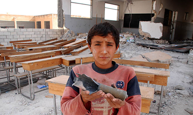 Escombros, dibujos desperdigados por el suelo, mezclados con cascotes, compañeros heridos con metralla... A pesar del riesgo que suponía salir a la calle, no quería dejar de ir a clase. “Quieren ir al cole en medio de la destrucción y el horror”, dice Alberto Hugo Rojas. Tienen claro que la escuela es su única opción para intentar construir un futuro distinto.