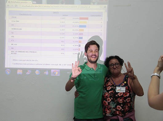 Al Porcus ya había llegado el cabeza de lista de Podemos, Carlos Meca, y también había llegado la tecnología. Un ordenador proyectaba los datos en una pared. “Ponlo otra vez a ver si subimos”, decía un recién elegido concejal sobre los datos de Arrecife, a pesar de que sabía que el escrutinio ya estaba en el cien por cien.