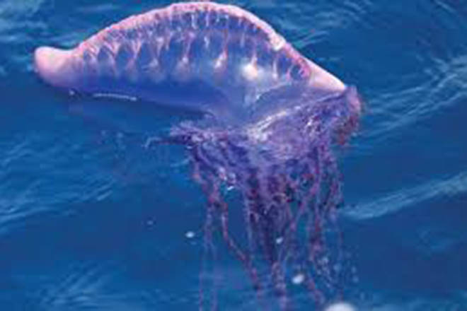En la zona se han visto una gran cantidad de carabela portuguesa (Physalia physalis), también conocida como fragata portuguesa, agua mala, botella azul o falsa medusa. Se denomina falsa medusa porque es en realidad un organismo colonial cuyos individuos se especializan para mantener viva la colonia. Pero las medidas que se toman con ella son las mismas porque tiene una picadura peligrosa y muy dolorosa.