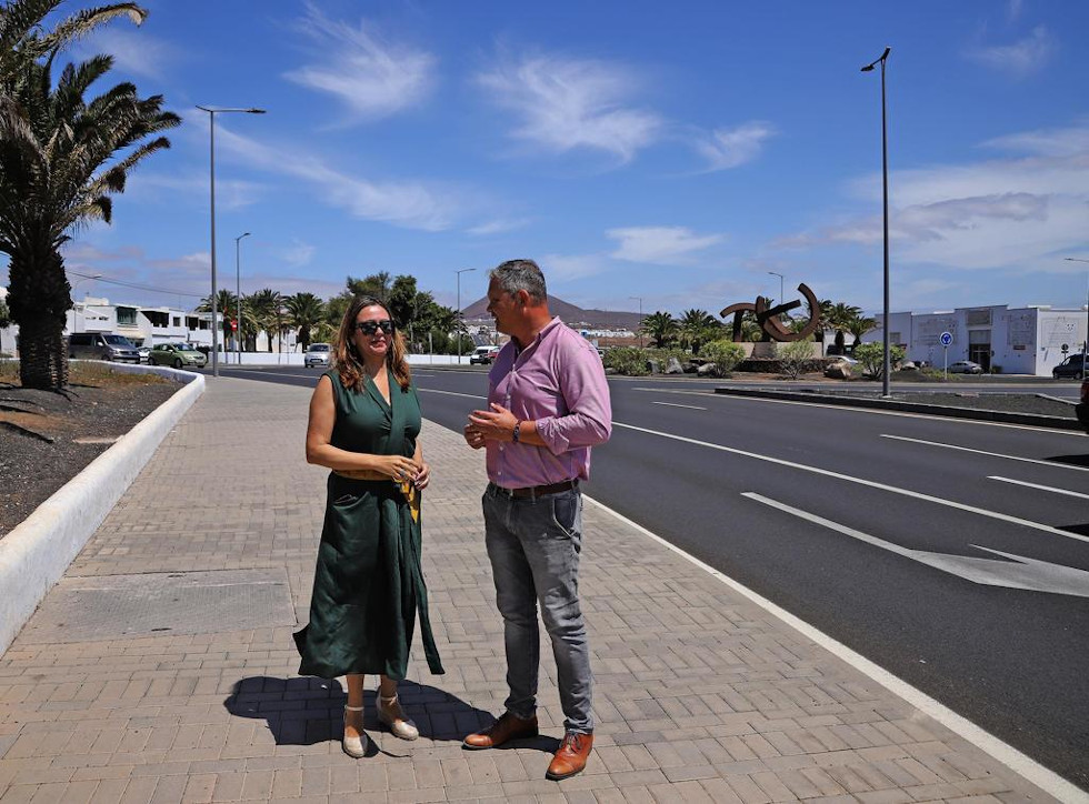 La presidenta del Cabildo de Lanzarote, María Dolores Corujo, y el consejero de Obras Públicas, Alfredo Mendoza, han visitado las obras de acondicionamiento de la calle León y Castillo entre las glorietas de la LZ-3 y la calle Mosta y Bilbao, ya finalizadas.