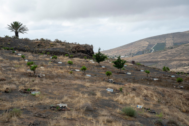 En una finca familiar de Máguez, Suso Pérez ha plantado, no uno, sino 154 pinos. Un par de ellos se pueden ver ya generosamente frondosos, fueron los primeros que cultivó en el espacio natural. Un cartel prestado con la leyenda “espacio natural sensible” en mayúsculas advierte de lo que el visitante puede encontrarse en una zona de difícil acceso a la que es recomendable acudir a pie. Unos dos kilómetros desde Máguez, calcula.