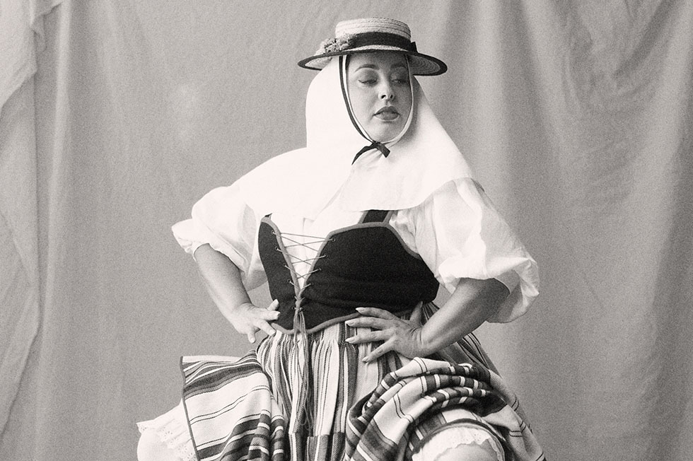 La imagen de portada de la agenda cultural de septiembre está protagonizada por la cantante Almudena Hernández Toledo, ataviada con un vestido cedido por la agrupación Coros y Danzas de Lanzarote que recrea la vestimenta tradicional de la Isla entre los siglos XVIII y XIX, aportando un guiño visual a la historia insular dentro de la programación del mes.
