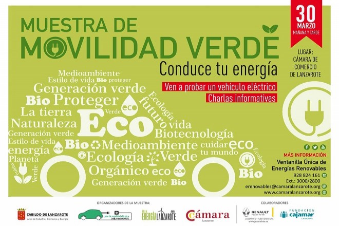 El jueves 30 de marzo, en la Cámara de Comercio de Lanzarote, se celebra una Muestra experiencial de Movilidad Verde, que tiene como objetivo que todos los que no conocen el funcionamiento del vehículo eléctrico puedan conocer sus ventajas, subirse a uno y conducirlo.