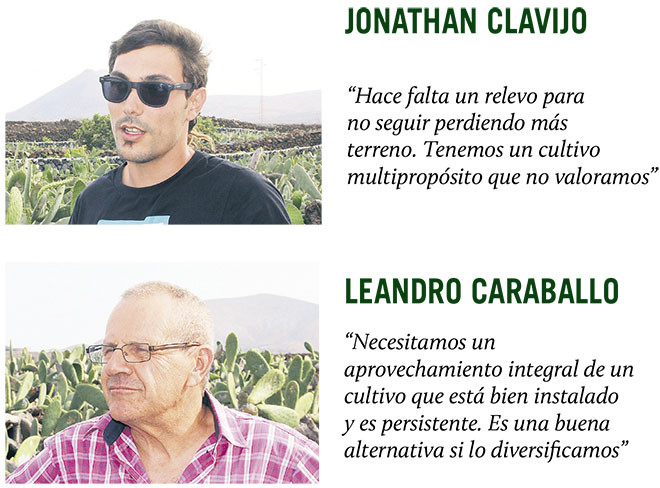 Ante la expectativa de que se produzcan limitaciones en el uso de los tintes artificiales, Leandro señala que “podría ser” pero que también se están difundiendo noticias sobre que ya existen grandes explotaciones en Marruecos y otras zonas de África. Que junto a sus actuales competidores, como son Perú, México o Portugal tampoco hacen pensar en un futuro alentador para sacar al mercado el stock y que el informe de la Fundación Galván Bello sitúa en torno a 60.000 kilos, con partidas de cerca de 35 años. Leandro y Pedro Juan hablan de que muchos fueron los que hace una década dejaron de recolectar la cochinilla.