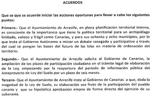 El pleno del Ayuntamiento de Arrecife aprobó una iniciativa de Somos Lanzarote para que se inste al Gobierno de Canarias a que por la “magnitud” de la Ley del Suelo, “su elaboración sea fruto de la participación del pueblo canario y que su hipotética aprobación emane de forma directa del ejercicio de su soberanía”, en alusión a un reférendum.