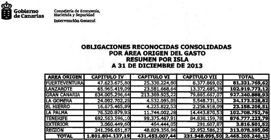 Lanzarote fue en el último año la tercera isla del Archipiélago en cuanto a las obligaciones presupuestarias ejecutadas a 31 de diciembre de 2013, según un informe del Gobierno de Canarias sobre “la distribución insular del gasto realizado”.