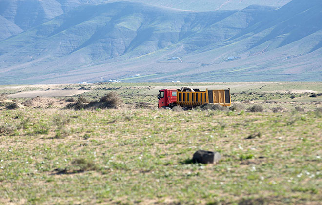 La extracción de áridos en esta zona está ligada a las fases de mayor desarrollo de la construcción en la Isla. “El último ciclo siguió hasta cerca de 2008, cuando, con el estallido de la burbuja inmobiliaria, se dejaron abandonadas y sin restauración algunas explotaciones que habían sido autorizadas hasta ese momento”, señala Elena Solís, de Ecologistas En Acción Lanzarote. Los concesionarios están obligados a llevar a cabo medidas de restauración paisajística que no se han hecho en la mayoría de los casos ante la falta de vigilancia y de control. Algunas de las explotaciones abandonadas y no restauradas se han convertido además en vertederos incontrolados. Solís señala, igualmente, que hay una dejadez por parte del Cabildo de Lanzarote y del Gobierno de Canarias por no reemplazar los carteles colocados en este lugar que indican que se trata de una zona de protección.