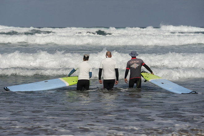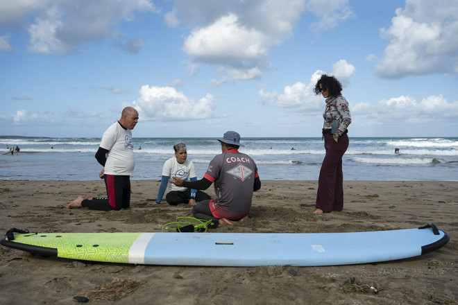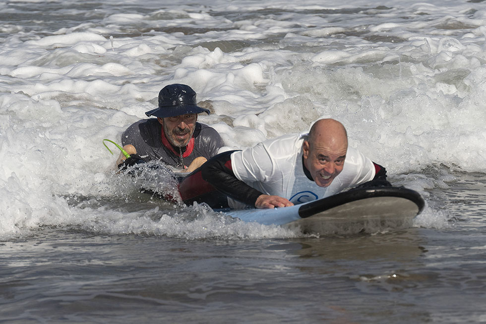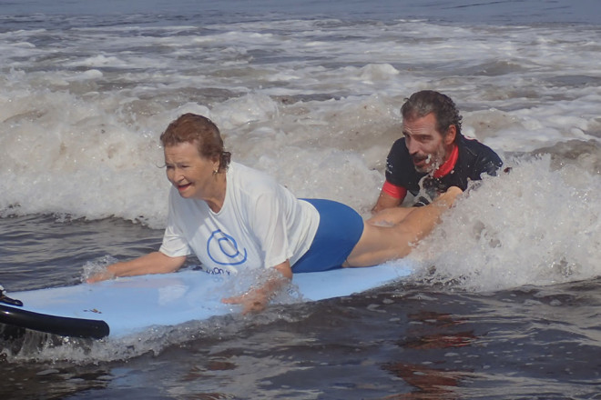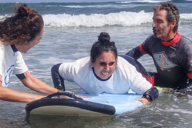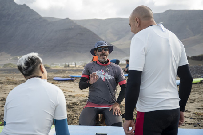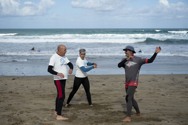 Con las personas de edad avanzada, o cuando hay algún tipo de discapacidad física que dificulte la actividad, las sesiones se adaptan. Desde elegir días con mar tranquila en Famara, para que con su ayuda puedan deslizarse tumbados sobre la tabla; hasta trasladar las sesiones a Playa Honda, cuando tienen problemas más severos de movilidad. “Ahí hacemos más ejercicios de flotación, de caminar con el agua por la cintura... Surf therapy es un poco la gorra de este proyecto, pero en realidad es un proyecto de oceanoterapia, es decir, disfrutar del poder del océano para que la gente se sienta mejor”.