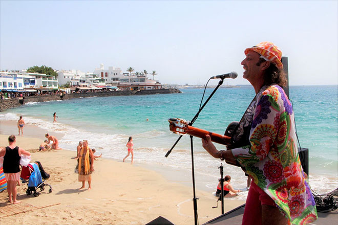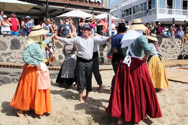 La música tradicional canaria llegó de la mano del grupo El Golpito, que no solo recorrió la peatonal calle Limones, sino que luego actuó en el paseo marítimo reforzado por el grupo de baile Altaja del municipio de Teguise.
